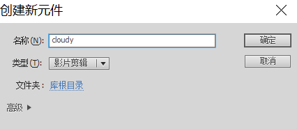 (2)【新建元件】执行【插入】|【新建元件】命令,在弹出的对话框中填写元件名称【cloudy】,类型【影片剪辑】元件,如图4-5-17。