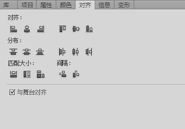 【对齐面板】由排列对齐、分布对齐、匹配大小、间隔以及相对舞台同几部分组成: