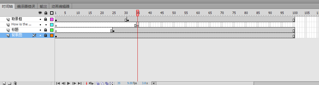 (6)【延续帧】 将所有图层的帧利用F5设置帧延续的第100帧,在图层【How is the weather】的第35帧设置关键帧,如图4-5-8。