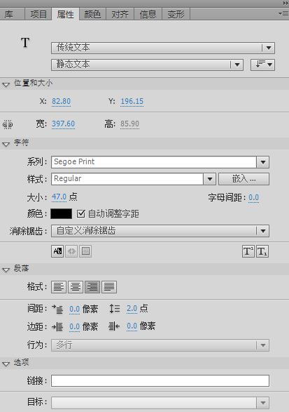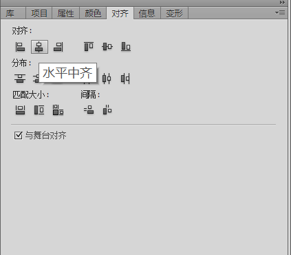【对齐面板】由排列对齐、分布对齐、匹配大小、间隔以及相对舞台同几部分组成: