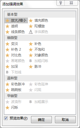 选中需要添加动画的对象,点击【动画】→【添加动画】,在【添加动画】的下拉列表中选择合适的强调动画即可,如图6-41所示。与添加进入效果类似,可以在【添加动画】的下拉列表中选择【更多强调效果】,图6-42为“添加强调效果”对话框。