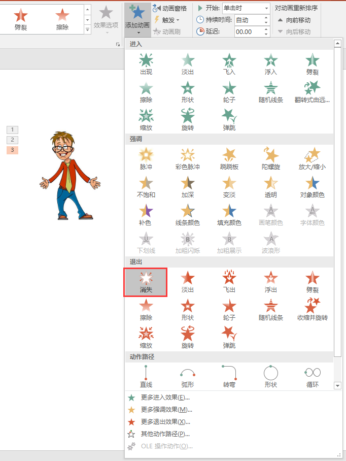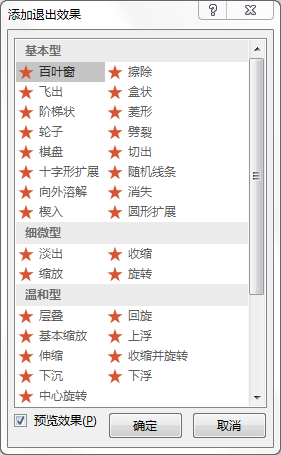 退出动画与进入动画相反,可以实现一个或多个对象从有到无、逐渐消失的动画效果。