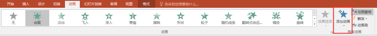 为对象添加动画时,若此对象只需一个动画,例如只添加一个进入动画,那么可以在【动画】选项卡的【动画】组中直接点击便可添加,如图6-46所示。若此对象需要添加多个动画,例如添加一个进入动画和一个退出动画,那么在添加第二个动画时,需从【动画】选项卡的【添加动画】处进行添加,如图6-47所示。