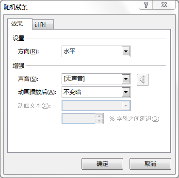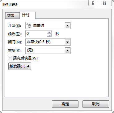 在动画效果的下拉列表中选择【计时】,可以设置与开始时间、循环等相关的选项,图6-51为“随即线条”动画的计时对话框,其中【开始】在上述内容中已经详细描述,此处不再赘述。