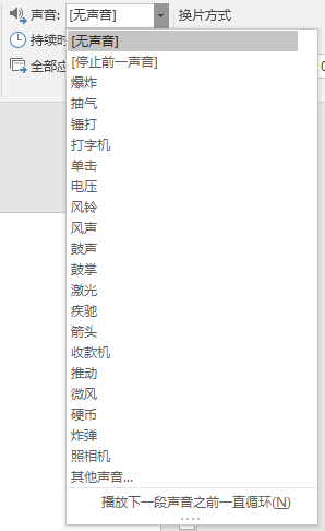 为幻灯片设置切换声音后,从上一张幻灯片切换到此幻灯片时会播放某种声音。PowerPoint2016提供了多种声音,如图6-53所示,同时也支持用户添加自己电脑中的声音。