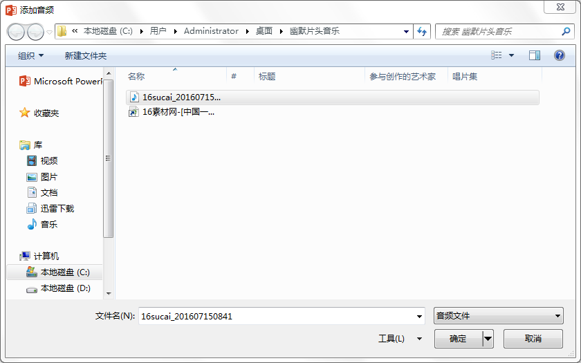 选中某个幻灯片缩略图后,进入【切换】选项卡,点击【声音】下拉按钮,从下拉列表中选择合适的声音即可,若需添加自己电脑中的声音,在下拉列表中选择【其他声音】,会弹出“添加音频”的对话框,如图6-54所示,选中要添加的音频并点击【确定】即可。