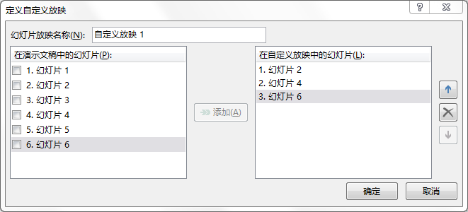 点击【幻灯片放映】→【自定义幻灯片放映】→【自定义放映】,会弹出如图6-55所示的对话框;选择【新建】后会出现如图6-56所示的对话框,选择需要放映的幻灯片并点击【添加】,若需更改幻灯片出现的顺序,可以选择某张幻灯片,点击旁边的上下箭头即可调整该幻灯片出现的顺序,如果不需要某张幻灯片,可以选中它并点击旁边的错号,即可删除该幻灯片;然后键入幻灯片放映名称并点击【确定】,此时会再次弹出“自定义放映”对话框,如图6-57所示,点击【放映】即可立即观看,若点击关闭,可在【自定义幻灯片放映】的下拉列表中找到该定义好的幻灯片。